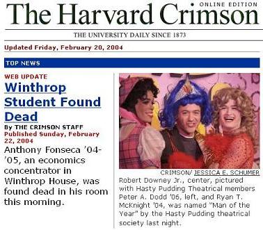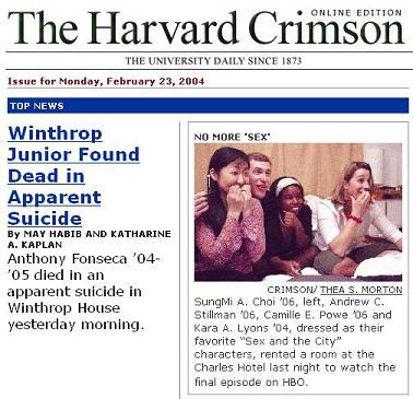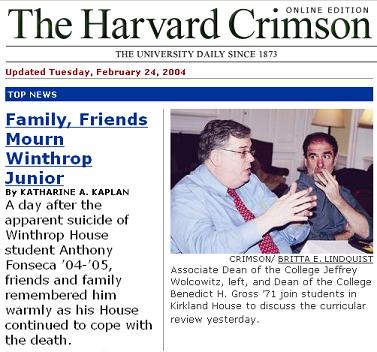 Tuesday, January 13, 2004 11:45 PM At Last, Some Veritas From the Harvard Crimson, 1/12/04: College Faces Mental Health Crisis "An overwhelming majority of Harvard undergraduates struggle with mental