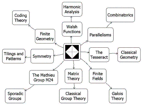 affine geometry, affine planes, affine spaces, automorphisms, binary codes, block designs, classical groups, codes, coding theory, collineations, combinatorial, combinatorics, conjugacy classes, the Conwell correspondence, correlations, Cullinane, R. T. Curtis, design theory, the diamond theorem, diamond theory, duads, duality, error correcting codes, exceptional groups, finite fields, finite geometry, finite groups, finite rings, Galois fields, generalized quadrangles, generators, geometry, GF(2), GF(4), the (24,12) Golay code, group actions, group theory, Hadamard matrices, hypercube, hyperplanes, hyperspace, incidence structures, invariance, Karnaugh maps, Kirkman's schoolgirls problem, Latin squares, Leech lattice, linear groups, linear spaces, linear transformations, Mathieu groups, matrix theory, Meno, Miracle Octad Generator, MOG, multiply transitive groups, octads, the octahedral group, orthogonal arrays, outer automorphisms, parallelisms, partial geometries, permutation groups, PG(3,2), Plato, Platonic, polarities, Polya-Burnside theorem, projective geometry, projective planes, projective spaces, projectivities, Reed-Muller codes, the relativity problem, Singer cycle, skew lines, Socrates, sporadic simple groups, Steiner systems, Sylvester, symmetric, symmetry, symplectic, synthemes, synthematic, tesseract, transvections, Walsh functions, Witt designs