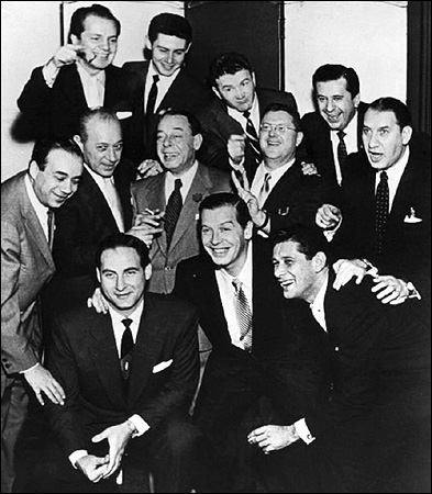 Gene Baylos, at left in middle row, in 1960's with other Friars, from left: top, Joey Adams, Eddie Fisher, Red Buttons and Morey Amsterdam; middle, Mr. Baylos, George Raft, Joe E. Lewis, Sam Levenson and Henny Youngman; front, Sid Caesar, Milton Berle and Jan Murray. |