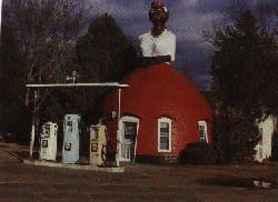 On Highway 61 outside of Natchez, Mississippi, stands Mammy's Cupboard, a thirty foot high concrete figure of a black woman. For years she was a landmark, staring with electrified lights beneath a pillbox cap, wearing earrings made of horseshoes and holding a tray. Beneath Mammy's red brick skirts, punched with arched windows, Mrs. Henry Gaude for years operated a small restaurant, its dining room supported inside with cypress beams recovered from a cotton gin house. Mrs. Gaude catered to tourists drawn by Natchez Pilgrimage of Homes--a annual tour of the town's grand old houses and an effective celebration of the plantation myth. Edward Weston photographed the place in 1941, white washed with cylindrical shell pumps. Later, the familiar round blue sign of the old Bell system stands at the door and out front are three Shell gasoline pumps, one white, one yellow and one sky blue.