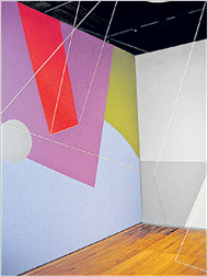 “Talking With Bramante, Rope Drawing No. 111,” which he made for this show, could be called an allover sculpture. Its geometric patterns, covering the wall from floor to ceiling, are painted in a Fra Angelico-like palette. Not only do the ropes that are strung diagonally across the room transform the piece into a labyrinth, but they also turn the viewer into an active spectator — to see the piece in its entirety, you have to step over or duck under the ropes.