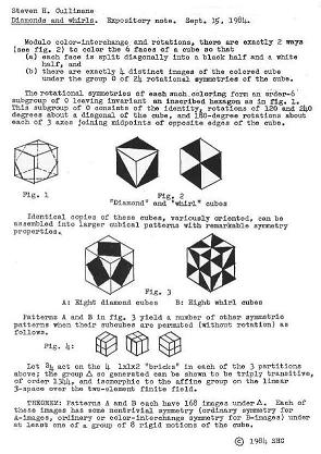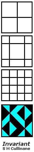 The three line diagrams above result from the three partitions, into pairs of 2-element sets, of the 4-element set from which the entries of the bottom colored figure are drawn. Taken as a set, these three line diagrams describe the structure of the bottom colored figure. After coordinatizing the figure in a suitable manner, we find that this set of three line diagrams is invariant under the group of 16 binary translations acting on the colored figure.
