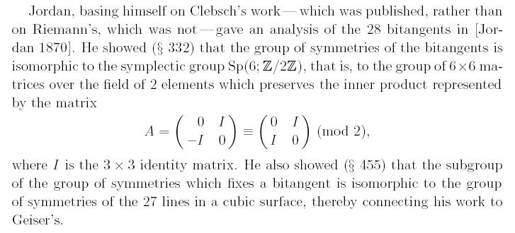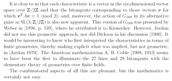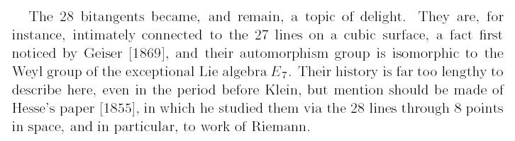 The Eightfold Way deals with Klein's quartic, which, like all non-singular quartic curves, has 28 bitangents. The relationship of the 28 bitangents to the 27 lines of a "Solomon's seal" in a cubic surface is sketched at the Mathworld encyclopedia. For more details, see the excerpt below, from Jeremy Gray's paper in The Eightfold Way.